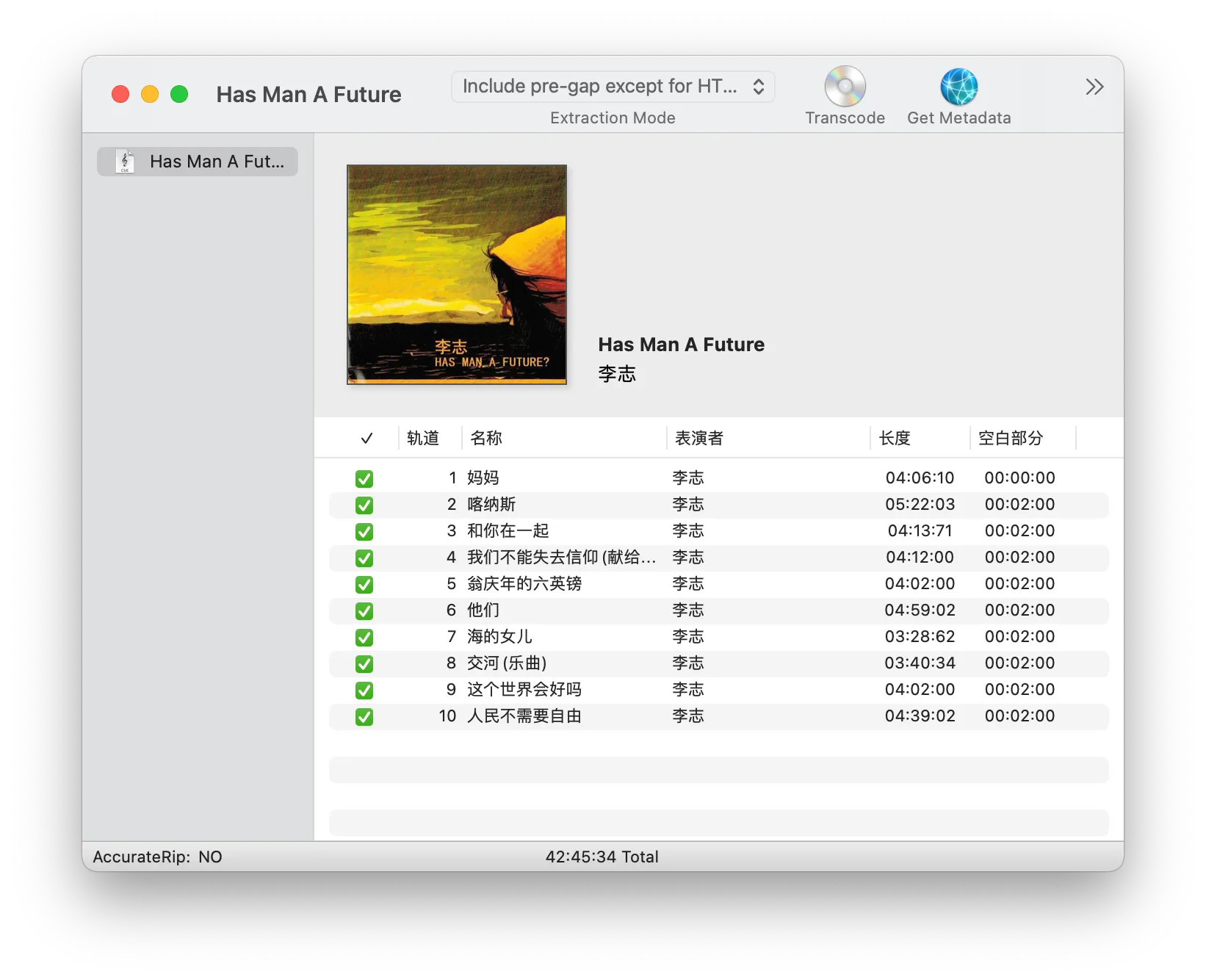 直接用 XLD 点开 cue 文件,把封面图拖上去,对没有正确识别的歌名稍作修改后点击 Transcode 即可。