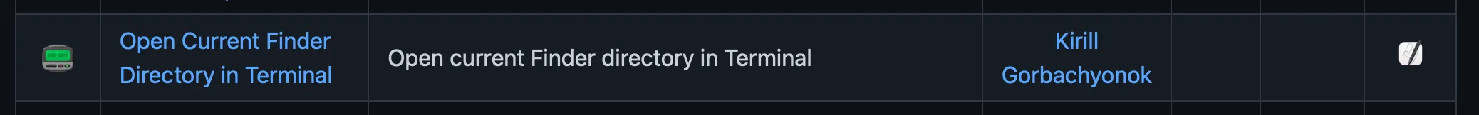 安装插件很方便,除此以外一些简单的脚本可以在官方维护的这个库里找到 raycast /script-commands 例如这个从当前文件夹打开终端就很方便,省的右键点击目录再打开了。